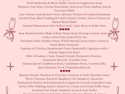3 course Valentines Themed menu £38 pp between 12-9pm