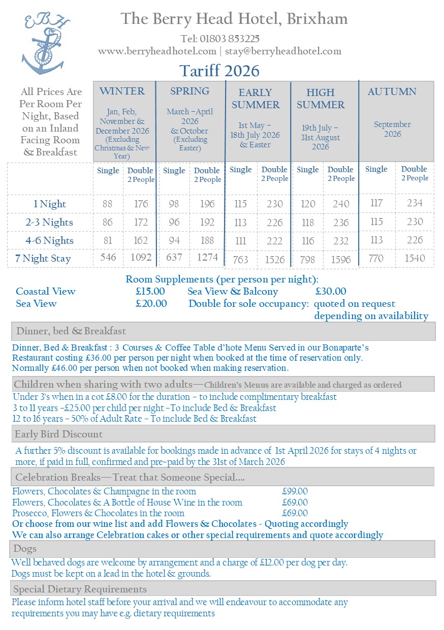 Dinner, Bed & Breakfast : 3 Courses & Coffee Table d’hote Menu Served in our Bonaparte’s Restaurant costing £36.00 per person per night when booked at the time of reservation only. Normally £46.00 per person when not booked when making reservation